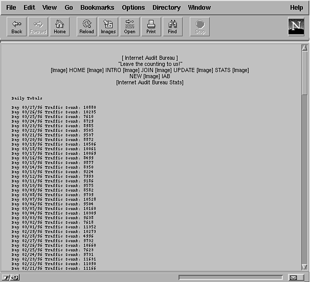 Figure 41.7 shows a site hooked up for I-Audit, one of the better online auditors. The graphic is downloaded from the I-Audit site, along with an account number. The folks at I-Audit are monitoring their log; every day or so they update their statistics to show the number of visits your site has had. The resulting report is shown in Figure 41.8.