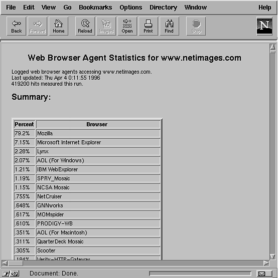 One of the challenges an agent log analyzer must deal with is so-called cloaked browsers. For example, Microsoft Internet Explorer identifies itself both in its own name and as Mozilla (that is, Netscape). The better browser analyzers can discriminate between a true name of the browser and the cloaked name. Figure 42.10 shows the output of BrowserCounter, from <http://www.netimages.com/~snowhare/utilities/browsercounter.html>.