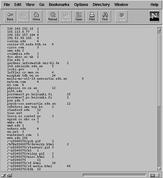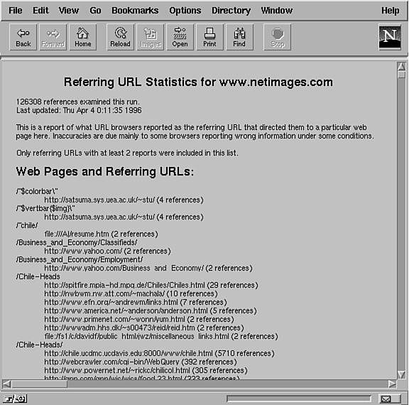 At one time, several dedicated programs read these logs. The trend has been to move this functionality into the programs that are already being used to read the access logs. For example, W3Perl, described earlier, will examine the agent and referer logs, as shown in Figure 42.9.