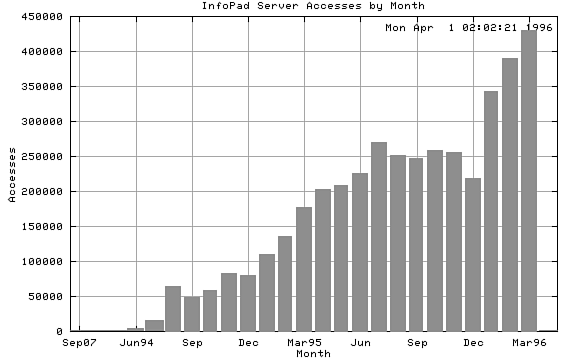 wusage runs at about five percent of the speed of getstats and is incremental. The output is available in GIF files, such as the one shown in Figure 42.1, to make it more comprehensible.