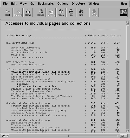 This Perl script works with proxy/cache servers as well as conventional systems. It's rather slow, running at about two percent of the speed of getstats, and doesn't support incremental analysis. Details and the source are available at http://www.unimelb.edu.au/pwebstats.html. Figure 42.4 shows the fine detail available from this script.