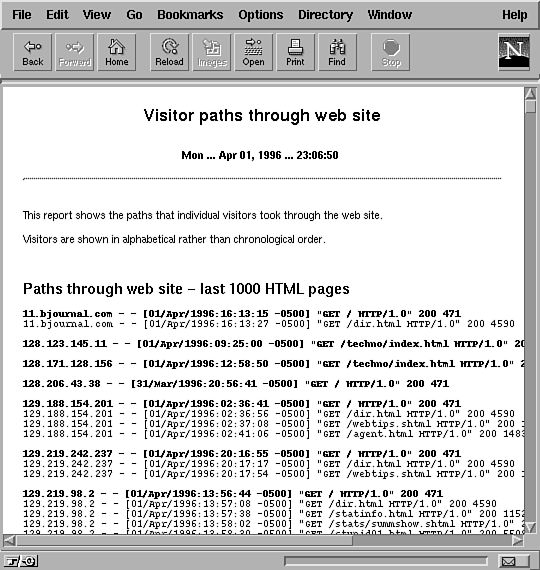 Chapter 41, "How to Keep Them Coming Back for More," shows the depth of information about a site that you can get from the access logs, also known as transfer logs. Many tools on the Net can help you make sense out of this, and other, logs. This chapter explores these logs and tools, and recommends how to improve site efficiency based on log analysis.