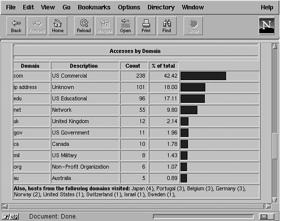 WAMP, available at http://www.wwu.edu/~n9146070/wamp.html, is good at one thing-which domains accessed the site. Figure 42.3 shows a sample of the output from this Perl script.