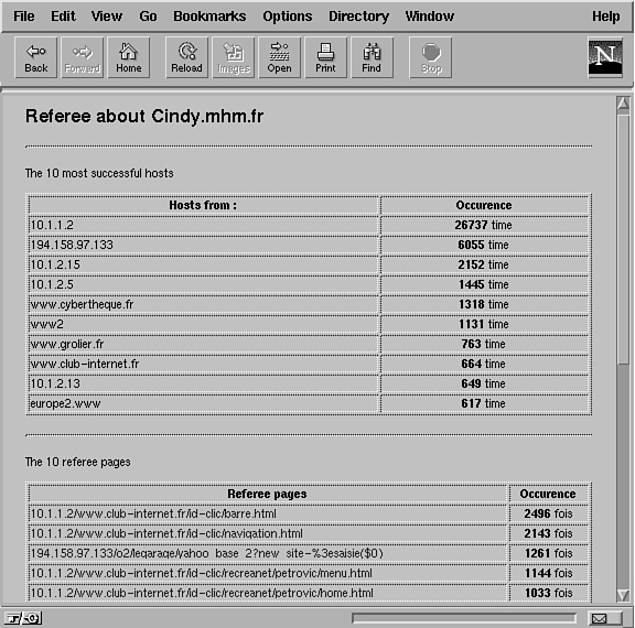 Unlike the other programs in this section, W3Perl looks at referer and agent logs as well as the transfer log. It's the slowest analyzer tested in the Uppsala study, coming in at less than one percent of the throughput of getstats, although it does handle incremental input. Figure 42.9 shows its output. More information about W3Perl is available at http://www.club-internet.fr/~domisse/w3perl/Docs/html/index.html.