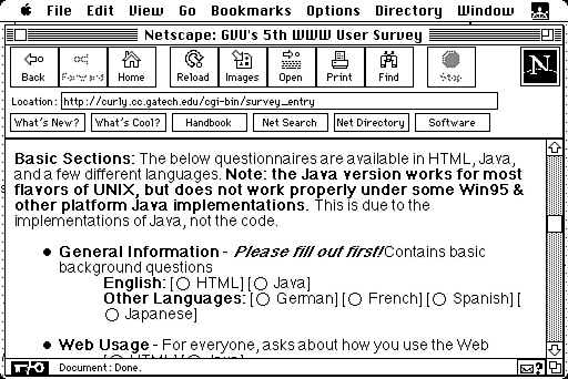 The GVU staff elected to implement their questionnaire as a multipart form. Each page contains hidden fields that help the software link together the responses of a user.