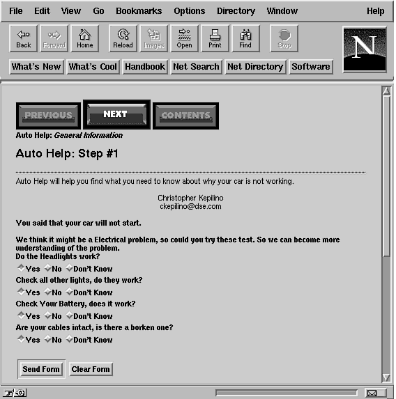 The first screen (refer to Fig. 9.5) asks the user about general symptoms. Suppose the user says the car won't start. When the user submits the page, the system considers two possible scenarios: