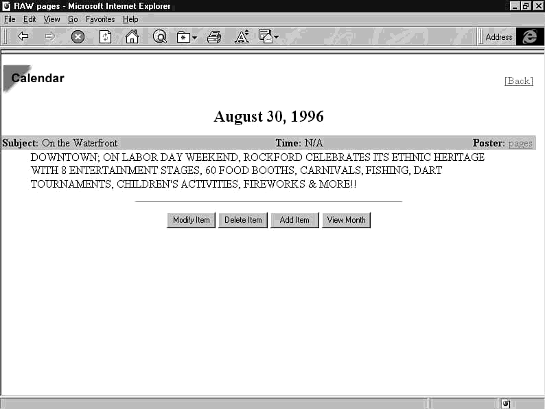While the code in listing 22.4 only displays the time and description of each event, you can get as fancy as you want with your pages. For example, if you are letting users submit their own events to the calendar, you may want to display the name of the poster as well (see figure 22.4).