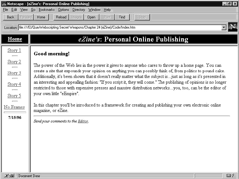 The first step is to include a <NOFRAMES> block in the index.htm file. This contains the contents of the <BODY> block from cover.htm. After that, adding one more script block to each of the article files creates the navigation bar (see listing 24.6).