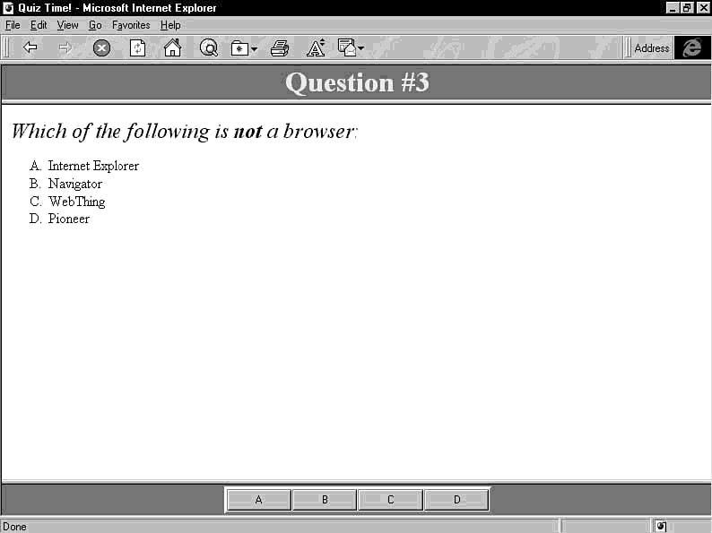 This last step bears further discussion. When the user first enters the question area, he or she is presented with the Welcome screen. At this point, the nav frame contains one button: Begin. Once the user has entered the quiz, however, the nav frame needs to contain the multiple-choice selection buttons, so a new page needs to be loaded, but only with the first question. Reloading the page doesn't do any harm, but because the page itself doesn't change between questions, reloading it is unnecessary.