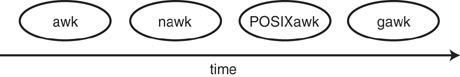 Figure 4.1. Refer to the end of the chapter for more information and further resources on awk and its derivatives. FundamentalsThis section introduces the basics of the awk programming language. One feature of awk that almost continually holds true is this: You can do most tasks more than one way. The command line exemplifies this. First, I explain the variety of ways awk can be called from the command line--using files for input, the program file, and possibly an output file. Next, I introduce the main construct of awk, which is the pattern action statement. Then, I explain the fundamental ways awk can read and transform input. I conclude the section with a look at the format of an awk program. Entering Awk from the Command LineIn its simplest form, awk takes the material you want to process from standard input and displays the results to standard output (the monitor). You write the awk program on the command line. You can either specify explicit awk statements on the command line, or, with the -f flag, specify an awk program file that contains a series of awk commands. In addition to the standard UNIX design allowing for standard input and output, you can, of course, use file redirection in your shell, too; so awk < inputfile is functionally identical to awk inputfile. To save the output in a file, the file redirection awk > outputfile does the trick. Awk can work with multiple input files at once if they are specified on the command line. The most common way use awk is as part of a command pipe, where it's filtering the output of a command. An example is ls -l | awk '{print $3}', which would print just the third column of each line of the ls command. Awk scripts can become quite complex, so if you have a standard set of filter rules that you would like to apply to a file, with the output sent directly to the printer, you could use something like awk -f myawkscript inputfile | lp.