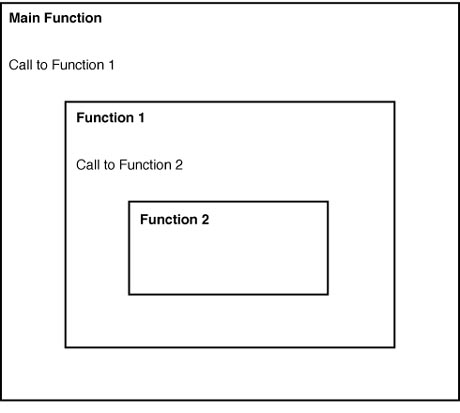 Figure 6.1. Figure 6.2 shows the way that function calls are nested within C programs. In the figure, the Main function calls Function 1, which calls Function 2. Function 2 is evaluated first, and its results are passed back to Function 1. When Function 1 completes its operations, its results are passed back to the Main function. Figure 6.2. Non-functional procedures in other languages often operate on data variables that are shared with other code in the program. For example, a non-functional procedure might update a program-wide COUNT_OF_ERRORS whenever a user makes a keyboard mistake. Such procedures must be carefully written, and they usually are specific to the program for which they first were created because they reference specific, shared data variables within the wider program. A function, however, receives all the information it needs (including the location of data variables to use in each instance) when it is called. It neither knows nor cares about the wider program context that calls it; it simply transforms the values found within the input variables (parameters), whatever they might be, and returns the result to whatever other function invoked it. Because they are implemented as functions, procedures written in C do not need to know whether, or how deeply, they will be nested inside other function calls. This capability allows you to reuse C functions in many different programs without modifying them. For example, Function 2 in Figure 6.2. might be called directly by the Main logic in a different C program. An entire C program is itself a function that returns a result code, when executed, to the program that invoked it. It is usually a shell in the case of applications but might also be any other part of the operating system or any other UNIX program. Because C programs are all structured as functions, they can be invoked by other programs or nested inside larger programs without your needing to rewrite them in any way.