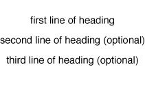 Macros are invoked in a text file by typing their names (with a period in the first position on the line). Macros can also be invoked with an apostrophe (single quote) instead of a period as the first character. This delays processing of the macro until the current line has been filled. A Heading Macro--Dissected and ExplainedA fairly straightforward example of a macro is that centered heading mentioned earlier. To create it, you need to provide spacing information before and after the heading, font information, size information, and position information (centering). Figure 10.1 shows a troff formatted heading. Listing 10.1 shows the primitives you might use to format headings. Figure 10.1. Listing 10.1. Basic troff source to format headings..sp 2 \"space before the heading .ce 99 \"turns on centering for the next 99 lines . \"to accommodate headings that might start . \"out as 1 line and then get longer .ft HB \"changes the font to Helvetica Bold .ps 14 \"changes the point size to 14 points .vs 16 \"changes vertical spacing to 16 points first line of heading second line of heading (optional) third line of heading (optional) .sp \"space after the heading .ce 0 \"turns off centering .ft \"returns to default font .ps \"returns to default point size .vs \"returns to default vertical space That simple series of troff primitives illustrates several important points. Most important, it is full of comments. Comments are identified by the sequence \". You can start the comment at any point on the line. If you want a comment on a line by itself, prefix it with a .. You can put a comment on a line by itself, at the end of a line of troff requests, or at the end of a line of text. You may want to use spaces to line up your comments to make them easier to read. Another useful technique, illustrated in the previous sample might be called generalization or thinking ahead. Instead of providing for a one-line heading with a simple .ce, which centers the next line of text, the sample code turns centering on by requesting .ce 99 (which centers the next 99 lines of text). Most headings are not much longer than that. After the heading lines are specified, the code turns centering off with a .ce 0. All of that code could be combined into a single pair of macros, called .HS (for heading start) and .HE (for heading end), so that all you need type is the three commands shown in Listing 10.2. Listing 10.2. Using special heading macros..HS first line of heading second line of heading (optional) third line of heading (optional) .HE This is a big improvement over typing all the commands shown in Listing 10.1, with exactly the same results. The syntax of the .HS and .HE macros is shown in Listing 10.3. Listing 10.3. .HS and .HE macros..de HS .sp 2 \"space before the heading .ce 99 \"turns on centering for the next 99 lines . \"to accommodate headings that might start . \"out as 1 line and then get longer .ft HB \"changes the font to Helvetica Bold .ps 14 \"changes the point size to 14 points .vs 16 \"changes vertical spacing to 16 points .. .de HE .sp \"space after the heading .ce 0 \"turns off centering .ft \"returns to default font .ps \"returns to default point size .vs \"returns to default vertical space .. What else might be done with a heading macro like .HS? Most often it would be combined with the .HE macro so that all you must type is: .H1 "first line of heading" This is much simpler to use, but a bit more difficult for the macro writer. This would produce the first level of headings and limited to one line of text. What if the heading came near the bottom of the page? There is nothing in the .HS macro to prevent the heading from printing all by itself just before a page break. You need at least three lines of text after the heading. Fortunately, there is a troff primitive trained for just this job--.ne. .ne (for need) says "I need the number of lines specified right after me or else I'm going to start a new page." Some word processors and DTP (DeskTop Publishing) software have "Keep with Next" feature that are similar to troff's .ne. How many lines do you need? Three (so there will be at least three lines of text after the heading), plus the heading itself, two more for the spaces before the heading, and one last line for the space after the heading. So a real working version of the sample heading macro might have .ne 7 at the top. This may seem like a lot of detail; it will get worse. If all you want to do is use a macro package to format documents, you may not want to learn how macros work. But, even if you have no intention of writing a macro yourself, it can be useful to understand how they work. It can save you a lot of time debugging the regular macro packages. The more you know about the way macros are written, the easier it is to format a document. The result of formatting with the .H1 macro is shown in Figure 10.2 with the macro source in Listing 10.4. Figure 10.2. Listing 10.4. .H1 macros..de H1 .ne 7 \"need 7 lines on page or start new page .sp 2 \"space down 2 spaces before the heading .ce 99 \"turn centering on \f(HB\s+2\\$1\fP\s0 . \"the font is Helvetica Bold, 2 points larger than . \"the body type, the heading itself - $1 -and then return to . \"previous font and default point size .ce 0 \"turn centering off .sp \"space down after the heading .. The .H1 macro allows one argument--the heading text. An argument provides additional information for the macro or primitive--like the 99 specified for the .he primitive. The "Arguments" section later in this chapter goes into more detail. An argument is coded in a special way. troff recognizes $1 as the first argument following the invocation of the macro (matching the common UNIX convention). There can be up to nine arguments to a single macro (again, a common UNIX convention).