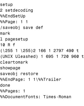 For example, suppose the following text is repeated many, many times in your document: .AL 1 .LI Log in as root. .LI Invoke the UNIX system administrative menu by typing \f(CWsysadm\fP and pressing Enter. .P The system administrative menu is displayed. .LI Select \f(CWEquine Systems\fP by highlighting the line and pressing Enter. .P The Equine Systems menu is displayed You could store this text in .Em (for Equine Menu) by prefacing it with .diEm and ending it with .di. Note that your diversion contains an unterminated list. If this is likely to cause problems, add .LE to the diverted text. To print the Equine Systems text, just put .Em in your file. In addition to .di, there is a .da (diversion append) primitive that works like .am. .da is used to add text to an existing diversion. It can be used over and over, each time adding more text to the diversion. To completely replace the text in a diversion, just define it again with a .diEm. The .am primitive can be used, like .am, to create Table of Content data. You can even have a diversion within a diversion. The "inside" diversion can be used on its own, as well. Trapstroff provides several kinds of traps: page traps (.wh and .ch); diversion traps (.dt); and input line traps (.it). Page traps usually invoke macros. For example, when troff gets near the bottom of a page, the trap that produces the page footer is sprung. A simple illustration of this is the following. Suppose you wanted to print the current date one inch from the bottom of every page in your document. Use the .wh primitive: .deDa \"define date macro \\n(mo/\\n(dy/18\\n(yr \"set date .. .wh 1i Da \"set the trap The order of the arguments is important. To remove this kind of trap, invoke it with the position, but without the macro name: .wh 1i. The .ch primitive changes a trap. If you wanted the date an inch from the bottom of the page on page 1 of your document, but an inch and a half from the bottom of the page on all subsequent pages, you could use .ch Da 1.5I, note that the argument order is different. Diversion traps are set with the .dt primitive, for example: .dt 1i Xx This diversion trap, set within the diversion, invokes the .Xx macro when (if) the diversion comes within one inch of the bottom of the page. Input text traps are set with the .it primitive. This trap is activated after a specified number of lines in your text file. There is a fourth kind of trap, though it is not usually thought of as a trap. This is the end macro (.em) primitive. .em is activated automatically at the end of your text file. It can be used to print overflow footnotes, Tables of Content, bibliographies, and so on. EnvironmentsThe .ev (environment) primitive gives you the ability to switch to a completely new and independent set of parameters, such as line length, point size, font, and so forth. It lets you return to your original set of parameters just as easily. This process is known as environment switching. The concept is used in page headers, for example, where the font and point size are always the same--and always different from the font and point size in the rest of the document. Three environments are available: ev 0 (the normal, or default, environment); ev 1; and ev 2. To switch from the normal environment, just enter .ev 1 or .ev 2 on a line by itself and specify the new parameters. These new parameters will be in effect until you specify a different environment. To return to your normal environment, use .ev or .ev 0. Listing 10.6 shows how you could use environment switching instead of writing the .Qb and .Qe macros. Listing 10.6. Using environments instead of .Qb and .Qe macros..ev 1 \"long quote begins .sp .ls 1 .in +1i .ll -2i text of quotation .sp .ev Environments are often used with diversions or with footnotes where the text is set in a smaller point size than body type. It is to accommodate diversions within diversions that the third environment is provided. DebuggingDebugging macros is a slow and often painful process. If you have a version of troff that includes a trace option, use it--but be warned: It produces miles of paper. If you do not have a trace option, you can use the .tm primitive (for terminal message) to print the value of a number register at certain points in your file. The value is sent to standard error, which is probably your screen. Use .tm like this: .tm Before calling the Xx macro, the value of xX is \n(xX. .Xx .tm After calling the Xx macro, the value of xX is \n(xX. You do not have hide the number register from copy mode because you put these lines right in your text file. You may want to delete these messages when the document is complete. The messages do not go to the printer but they can make your screen messy. troff OutputSometimes you have to look at troff output--it is not a pretty sight, but after the first few files, it begins to make sense. The troff code produced by a file with two words in it: UNIX Unleashed is shown in Figure 10.4. Figure 10.4. If you look hard, you can pick out the text in the long line. The numbers are horizontal motions reflecting the width of the letters. You can also see where the font positions are defined. The s10 on a line by itself is the point size. f1 is the font in position 1 (in this case, Times-Roman). The H and V numbers following the font definition specify the starting horizontal and vertical position on the page. PostScript OutputPostScript output is a little easier to read, but the set-up lines are endless. Where UNIX Unleashed generates 24 lines of troff code, the same two words generate more than 800 lines of PostScript code. The significant lines are at the beginning and the end. The last 17 lines of the PostScript produced by troff -Tpsc | psc of a file with two words in it: UNIX Unleashed is shown in Figure 10.5. Figure 10.5. Font and point size are specified as 10 R f (10 point Roman). Text is enclosed in parentheses (which makes it easy to find). The showpage is crucial. Every page in your d