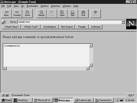 Listing 17.3 defines a TEXTAREA field and Figure 17.3 shows the resulting form on the Netscape browser. Listing 17.3. Defining a free-form TEXTAREA.<P> Please add any comments or special instructions below: <P> <TEXTAREA NAME="terms" ROWS=6 COLS=50> (comments) </TEXTAREA> Figure 17.3 Server-Side IncludesHTML has no provision for defining and calling subroutines. However, a similar functionality can be added to your Web pages by means of a technique called server-side includes.