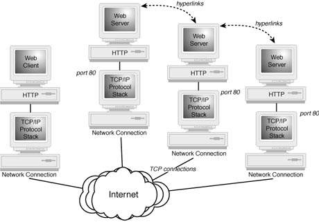 Later in this chapter we outline in some detail the defined HTTP message types and protocol header formats. By way of an introduction to that section, a useful first step will be to examine the logical operation of HTTP and its interaction with the other components parts found within the Web. Figure 21.1 outlines how the HTTP application protocol relates to both the Web server and client programs. As indicated, the browser has been designed to interpret format information contained within HTML pages. It is possible for an HTML page to also contain URLs as references to other pages located elsewhere on the Internet. These links are referred to as hyperlinks and are often colored or underlined within the HTML pages. Figure 21.1. The main function of the HTTP application is to request the pages referenced by these hyperlinks. This is accomplished through the following steps: