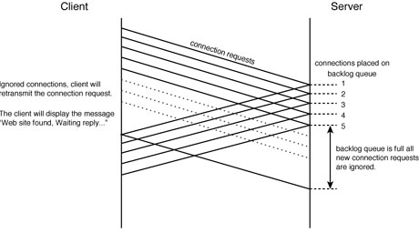 Identifying and Overcoming Some Performance ProblemsThis section will look at some real world implementations and uses of the HTTP application. In particular, we will focus on some recognized limitations of the application and provide, where possible, some alternative configurations to help ease recognized problems. There are there main areas within the operation of HTTP that have the potential to cause performance problems--connection establishment, connection termination, and communication protocol operation--we discuss some of the main issues of each. Connection Establishment--The Backlog QueueThere is an upper-limit to the number of outstanding TCP connection requests a given application server process can handle. Outstanding TCP connection requests are placed upon a queue known as the backlog. This queue has a predefined limit to the number of requests it can handle at any one time. When a servers backlog queue reaches its defined limits, any new connection requests will be ignored until space on the queue becomes available. If you have ever seen the message, "Web Site Found. Waiting for ReplyÉ", chances are that you have fallen victim to the problem of a complete backlog queue. During this time your Web browser will be resending the unanswered connection request in the hope that space on the backlog queue becomes available after a few seconds wait. To understand why HTTP is so susceptible to this problem, it is necessary to understand why a server would have any outstanding TCP connection requests. A server process will queue a connection request for two reasons: Either it is waiting for the completion of the connection request hand-shake, or it is waiting for the server process to execute the accept() system call. In order to establish a TCP connection, the client and the server must complete the three-way handshake. This process is initiated by the client, which sends a TCP connection request packet with the SYN flag set. The server will respond by sending a TCP packet with both the SYN and ACK flags set. The server will then wait for the client to acknowledge receipt of this packet by sending a final TCP packet acknowledging the server's response. While the server is waiting for this final response from the client the outstanding connection request will be placed in the backlog queue. Once a TCP connection has been established, the server process will execute the accept() system call in order to remove the connection from the backlog queue. It is possible on a busy server that the execution of this system call may be delayed and the connection request remain on the queue for an extended period of time. Generally, the server process will make the accept() call promptly and this will not cause the backlog queue to fill up. However, the required completion of the three-way handshake can and does cause the queue to fill and outstanding requests to be dropped. Why is this a particular problem of HTTP within the Internet? Well, it is possible for a Web server to fill its backlog queue if it receives a large volume of connection requests from clients facing a particularly large round trip time. Figure 21.2 illustrates that the Web server receives a number of connection requests in a very short period of time. The server responds back to each client--placing the outstanding request upon the backlog queue. Figure 21.2. As the figure illustrates, the backlog queue fills up and there is a period of time during which the Web server will ignore any new connection request. During this time the Web client will display the "Web Site Found. Waiting for ReplyÉ" message as it attempts to successfully complete a connection request. Default sizes of the backlog queue differ between UNIX flavors and implementations. As an example, BSD flavors of UNIX define the size of the backlog queue through the SOMAXCONN constant. Calculation of the size of the queue size is then derived using the following formula: backlog queue size = (SOMAXCONN * 3) / 2 + 1 By default, the SOMAXCONN constant is set to a value of five--providing for a maximum of eight outstanding TCP connections to be held on the backlog queue. Other UNIX flavors or TCP/IP implementations use other parameters and parameter values to limit the size of the backlog queues. For example, Solaris 2.4 uses a default value set to five and allows this to be incremented to 32; Solaris 2.5 uses a default of 32 and allows a maximum of 1024; SGI's IRIX implementation provides default queue size of eight connections; Linux release 1.2 defaults to 10 connections; and Microsoft Windows NT 4.0 provides for a backlog maximum size of six. For busy Web servers, system administrators should look to increasing the backlog size from the default values. Failure to do so can effectively limit the overall availability of their Web servers with the Internet.