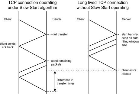 UNIX servers allocate a fixed number of TCBs--with values typically configurable up to a maximum of 1024. It is possible on a busy Web server for all available TCBs to become temporarily used up resulting "Web Site Found. Waiting for ReplyÉ" message being displayed to clients. The netstat program can be used to determine the number of outstanding TCBs currently in the TIME-WAIT state. Communication Protocol Operation--TCP and Congestion ManagementSome of the major criticism leveled at HTTP relate to its inefficient use of the underlying communication protocols. The TCP protocol was designed as a windowing communication protocol. Such protocols allow the receiving station to enforce a degree of flow control by providing an indication of how much data they are able to currently accept from the sender. The objective being that the receiving station can indicate to the sender how quickly it is able to process the sent data. Importantly, the use of windowing can fail to consider the capability of the connecting network to transfer the amounts of data within the advertised window sizes. Consider a data exchange between two network hosts: The receiving station, will advertise to the sender an amount of data it is able to receive up to a maximum value. The sending station will transmit the requested amount of data, which the receive will place within its buffers. The receiving station will read data from these buffers, freeing up space for it to accept more of the senders data. The receiver will request the sender transmit a window of data sufficient to fill the available space within its receive buffers. Such an operation will work fine--assuming that the network between the two hosts is capable of transmitting the requested volumes of data. Consider the case if the two hosts were connected a routed wide area link. If the router or the link became congested, it may not be able to process all of the data that the receiving station is advertising it can accept. The network needs to be able to indicate to the sending station to slow down its transmission! The receiving station might be advertising it is able to receive a given amount of data based on the fact that its buffers are empty, but the network in between cannot. The slow start algorithm provides this functionality. It does this through the operation of something called the congestion window. This value is incremented based upon the number of acknowledgment packets returned from the receiving station. The sending station will transmit an amount of data, which is the minimum of either the congestion window or the window size advertised by the receiver. In such a way, the sending station can now limit its transmissions based upon both the receiving station as well as the networks capability to handle different amounts of data. This relates to HTTP because slow start will add additional round trip delays to the transfer of data over established TCP connections. This is due to the fact that the congestion window size under the slow start algorithm is initialized to one packet--meaning that a sender will only transmit a single packet then await an acknowledgment from the receiving station. Upon receipt of each acknowledgment, the congestion window size will double in size until it matches the receivers advertised window size. Figure 21.3 shows how this additional round trip delay will affect the transmission under HTTP. This figure contrasts the effects of the slow start algorithm against that of a long lived connection. As the diagram indicates, the long lived connection transfers the receivers maximum window size of data enabling a fast transmission time. In contrast, under the slow start algorithm, additional delays are introduced while the sender waits for the receiver's acknowledgment packets. Figure 21.3. Under the TCP protocol, efficient transfers require long lived connection times, which reduce the overall impacts of the slow start algorithm. This is contrary to the operation of the HTTP application, which uses a number of ephemeral TCP connections, each of which being dedicated to transferring only a small amount of data. Each of these connections will invoke the slow start algorithm and, as such, reduce the overall efficiency of data transfers under HTTP. Increasingly, there is a growing desire to make greater use of persistent or long lived TCP connections within the operation of HTTP. These ideas are further examined in the following section.